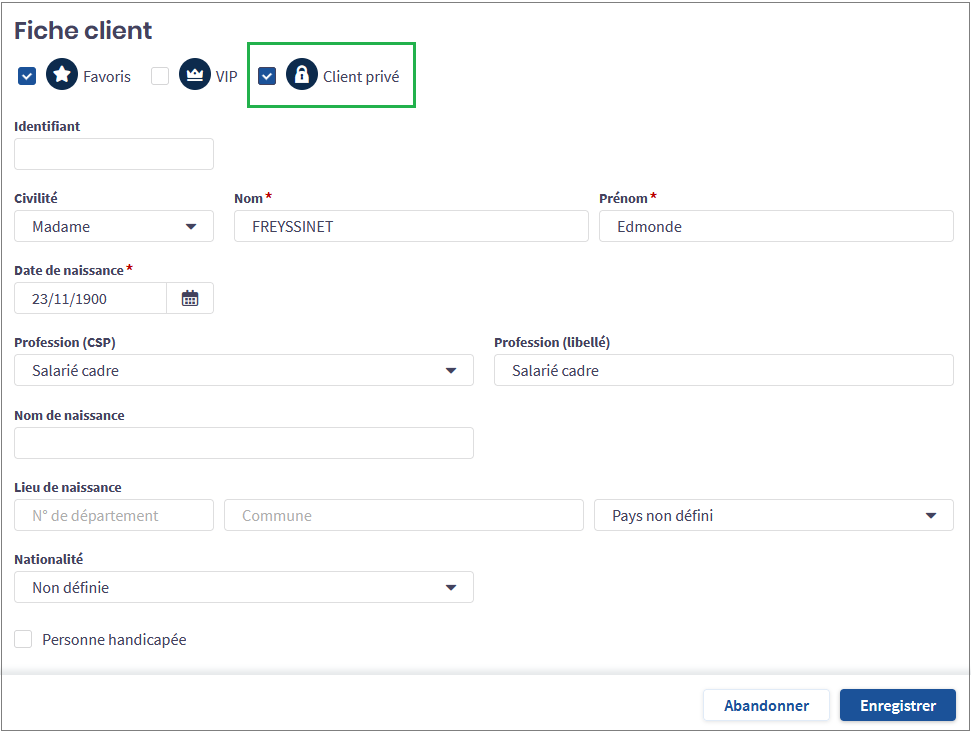 L’option de client privé est offerte dans les fiches clients créés par des utilisateurs de Clickimpôts. Si cette option est cochée pour un client, les informations sur ce client ainsi que ses dossiers seront uniquement accessibles par l’utilisateur même si une règle de lecture et /ou d’écriture a été définie au sein du groupe.