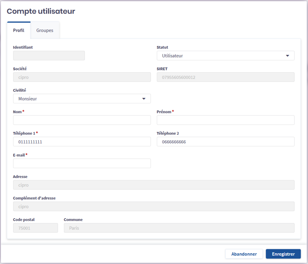 Notez que l’utilisateur peut modifier son identifiant et son adresse e-mail, depuis sa fiche Mon compte. Vous pouvez également les modifier.