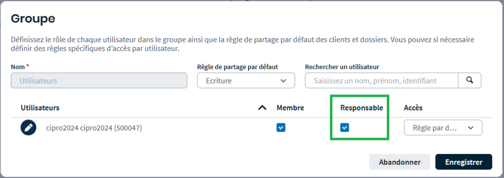 C’est également au niveau du groupe que doivent être désignés les utilisateurs à qui vous souhaitez octroyer la fonction de Responsable (personne pouvant déplacer les clients d’un utilisateur à un autre).