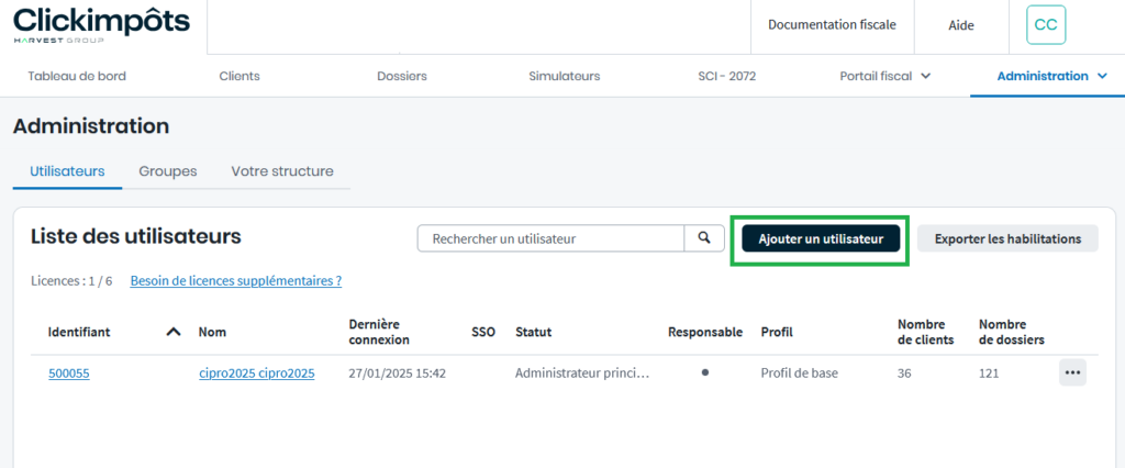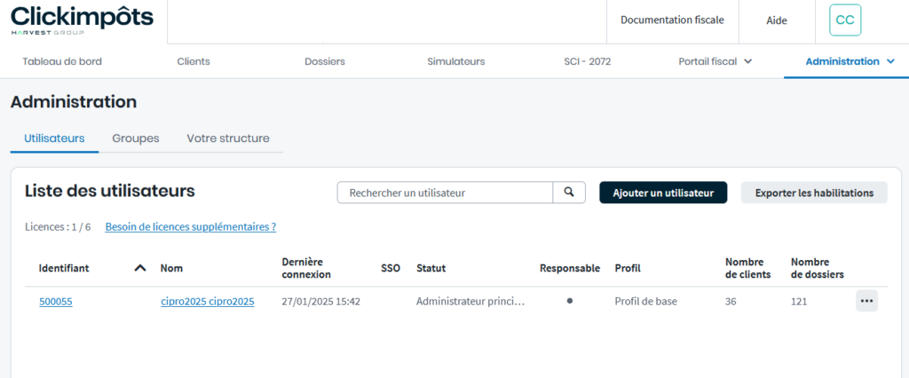 Quand vous accédez à l’administration de Clickimpôts pour la première fois, un seul utilisateur disposant des droits administrateur est présent dans la liste des utilisateurs. Pour créer les autres utilisateurs, suivez la procédure ci-dessous.