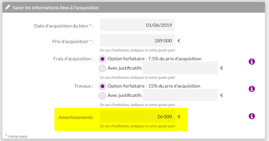 La navigation du simulateur a été revue. Toutes les saisies s’effectuent à présent au premier niveau (y compris le détail des frais d’acquisition), dans une seule page, afin de rendre plus agréable et rapide votre simulation. Les blocs concernant les informations d’acquisition et de cession ont été inversés pour faciliter également la saisie et les contrôles effectués.