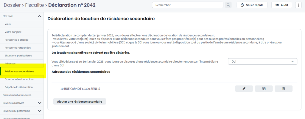 Cette information, y compris dans le cas où le contribuable n’est pas concerné, doit systématiquement apparaître dans la déclaration. Afin de faciliter l’accès à cette saisie, elle a été placée dans une page dédiée intitulée « Résidences secondaires » de la déclaration n°2042.