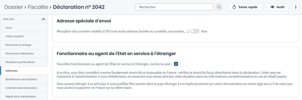 La DGFiP a complété les informations demandées dans le cas des fonctionnaires ou agents de l’État en service à l’étranger (type d’affectation, couple mixte, code régime). Nos équipes préparent actuellement ces nouvelles saisies qui seront mises en ligne rapidement.
