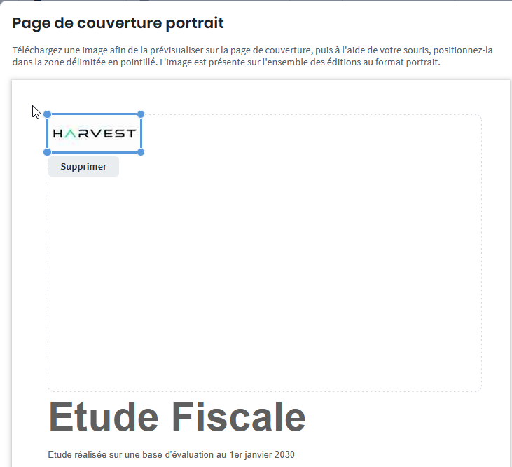 Vous visualisez immédiatement un aperçu de la page de couverture avec le logo inséré. Vous pouvez ensuite redimensionner l’image et la positionner librement à l’intérieur de la zone délimitée par des pointillés, en la faisant glisser à l’endroit souhaité.