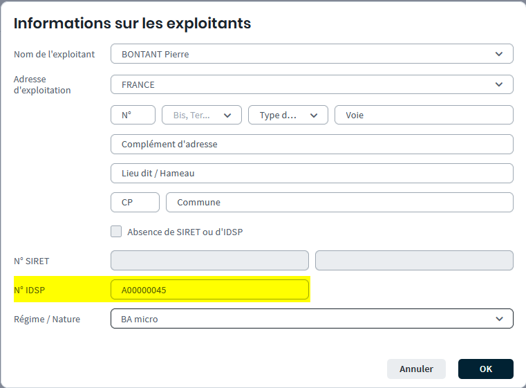 2/ Ajout du n° IDSP dans la saisie des exploitations TNS