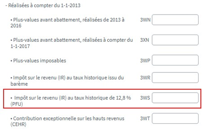 Cette nouvelle case permettant de déclarer l’IR au PFU (3WS) est positionnée en dessous de la case déjà existante permettant de déclarer l’IR issu du barème (3WR).