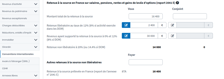 En attendant la prise en charge complète des non-résidents l’année prochaine, un ajustement a été effectué sur le calcul de la retenue à la source prélevée en France (case 8TA, report de la déclaration 2041-E). En effet, jusqu’ici, la retenue non libératoire n’était calculée qu’à partir du dépassement du seuil lié au barème annuel, qui était le seul considéré actuellement par Clickimpôts. Si la périodicité réelle a été différente (mensuelle, trimestrielle…), il faut en effet utiliser les « boutons-stylos » pour ajuster les montants de la retenue libératoire et de l’assiette des revenus correspondants.