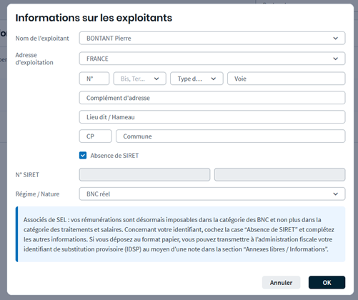 Si l’associé ne dispose pas de SIRET, il convient de renseigner les informations sur l’exploitant comme précisé dans cette nouvelle note :