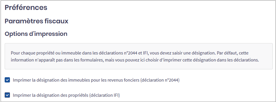 Comment faire figurer dans les impressions les désignations des propriétés / immeubles saisies dans les déclarations 2044 et IFI ?