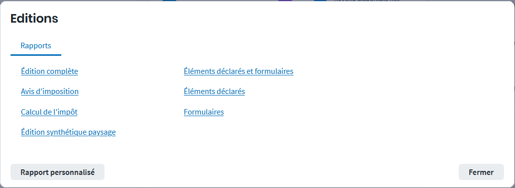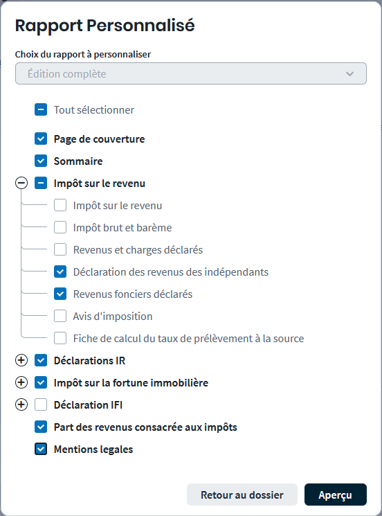 Note : le rapport personnalisé que vous constituez (cases cochées et décochées) est conservé dans Clickimpôts, même après une déconnexion de l’application.