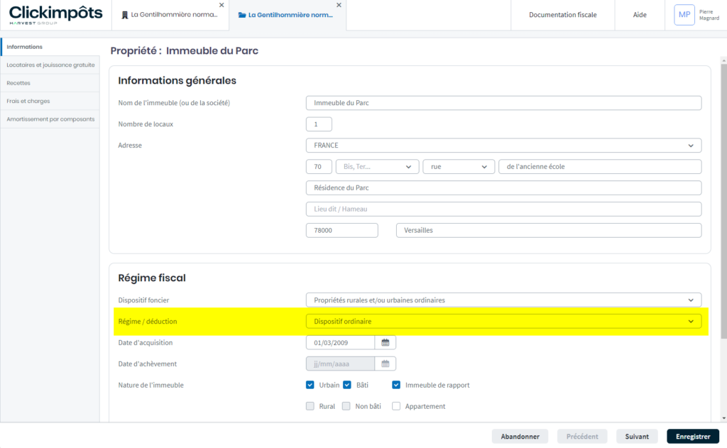• Si vous avez travaillé sur le dossier et ne voulez pas perdre vos saisies, vous devez dans ce cas vérifier pour chacune des propriétés présentes dans le dossier le régime appliqué et le corriger le cas échéant.