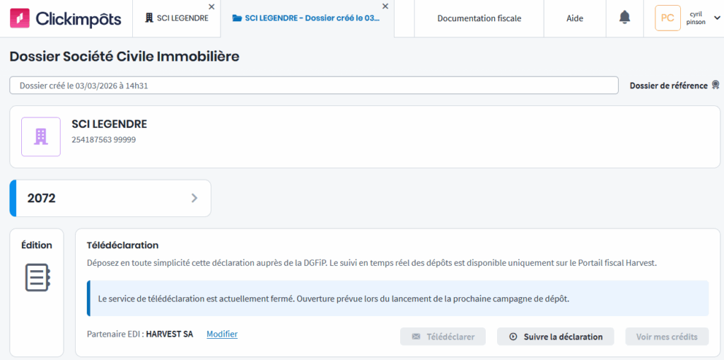 Dans Clickimpôts 2021 et supérieur, l’identité et les coordonnées d’une SCI sont communes à tous les dossiers de celle-ci. Ces informations ne peuvent être modifiées que dans sa fiche.