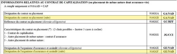 Pour les contrats de capitalisation, la DGFiP donne la possibilité de saisir la désignation du contrat et de l’organisme d’assurance sur 2 données texte. Dans Clickimpôts, une seule donnée étant disponible, seule la première est actuellement récupérée.