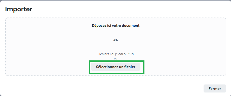 1. Dans la fenêtre qui s’ouvre, sélectionnez sur votre poste de travail le fichier *.EDI à importer (vous pouvez également le faire glisser à l’intérieur de la zone en pointillés)