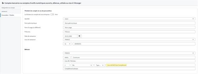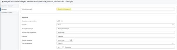 Pour les comptes bancaires ou les comptes d’actifs numériques à l’étranger, aucune donnée n’est prévue par la DGFiP pour saisir un libellé pour les personnaliser. Si votre solution précédente permettait de saisir un libellé (comme Clickimpôts), elle n’est pas présente dans le fichier EDI et ne peut donc pas être récupérée. Dans Clickimpôts, les comptes seront donc libellés « Compte à l’étranger n°1 », « Compte à l’étranger n°2 » … sans distinction entre les comptes bancaires et les comptes d’actifs numériques.