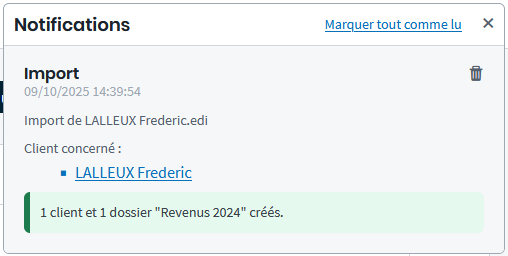 Si aucun client avec le même nom, prénom et date de naissance n’existe, un nouveau client est créé dans la liste des clients, et un dossier fiscal est généré pour l’année correspondant à celle indiquée dans le fichier EDI.