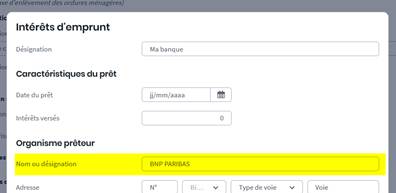 Pour le libellé des sociétés immobilières et des organismes prêteurs (liste des emprunts), la DGFiP donne la possibilité de saisir sur 2 données textes. Dans Clickimpôts, une seule donnée étant disponible, seule la première est actuellement récupérée.