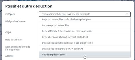 La catégorie « Autres dettes dont IFI théorique » en EDI est importée dans la catégorie « Autres impôts et taxes » de Clickimpôts.