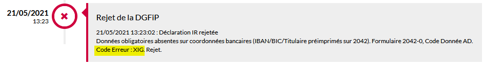 | XIG | Erreur sur les coordonnées bancaires.Vous avez coché la case indiquant que la DGFiP a déjà connaissance des coordonnées bancaires du contribuable. Toutefois, soit la DGFiP n’a en réalité pas connaissance de ces coordonnées (vérifiez sur la déclaration pré-imprimée que ces coordonnées sont mentionnées), soit elles ne correspondent pas exactement (vérifiez notamment le nom du titulaire), soit l’IBAN ne dispose pas des options de prélèvement à la norme SEPA. Pour corriger, vous devez décocher la case « Vous souhaitez utiliser les coordonnées déjà connues de l’administration » et saisir un RIB valide avant de déposer de nouveau la déclaration. |