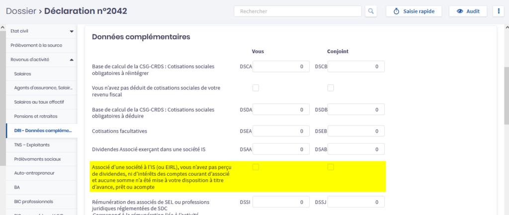 | Déclarant 1 : vous avez indiqué son affiliation au régime social des indépendants (case DSAE) ainsi que des revenus en cases 1GB ou DSSI. Vous devez dans ce cas saisir également la case DSAA (dividendes – associé exerçant son activité dans une société IS), éventuellement servie à 0. |