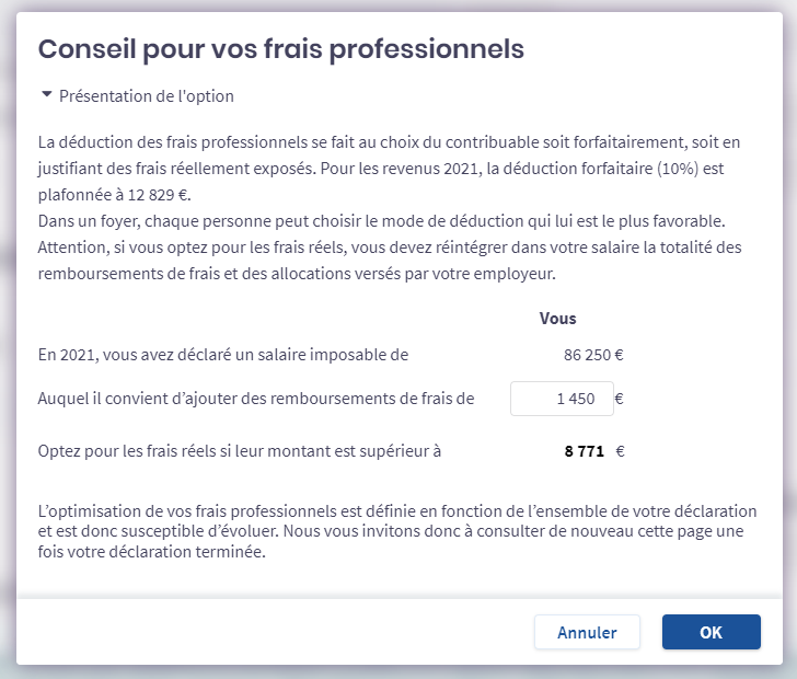 Pour rappel, Clickimpôts propose un outil de conseil permettant d’effectuer judicieusement le choix entre la déduction forfaitaire de 10 % et l’option pour les frais réels. Ce conseil est présent dans la déclaration n°2042 directement dans la page des salaires :