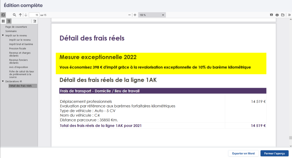 Ainsi, après avoir saisi comme habituellement les frais de déplacement dans la déclaration n°2042, une nouvelle ligne dans l’édition des frais réels présente le montant de cette économie d’impôt. Concrètement, deux calculs sont effectués (avec l’ancien et le nouveau barème) et la différence est présentée comme suit :