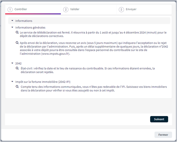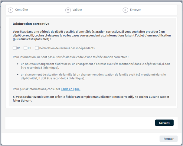 L’envoi de la déclaration corrective se fait ensuite de manière classique (étapes de contrôles, validation, envoi).