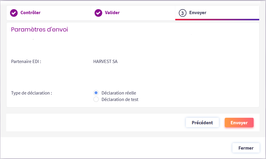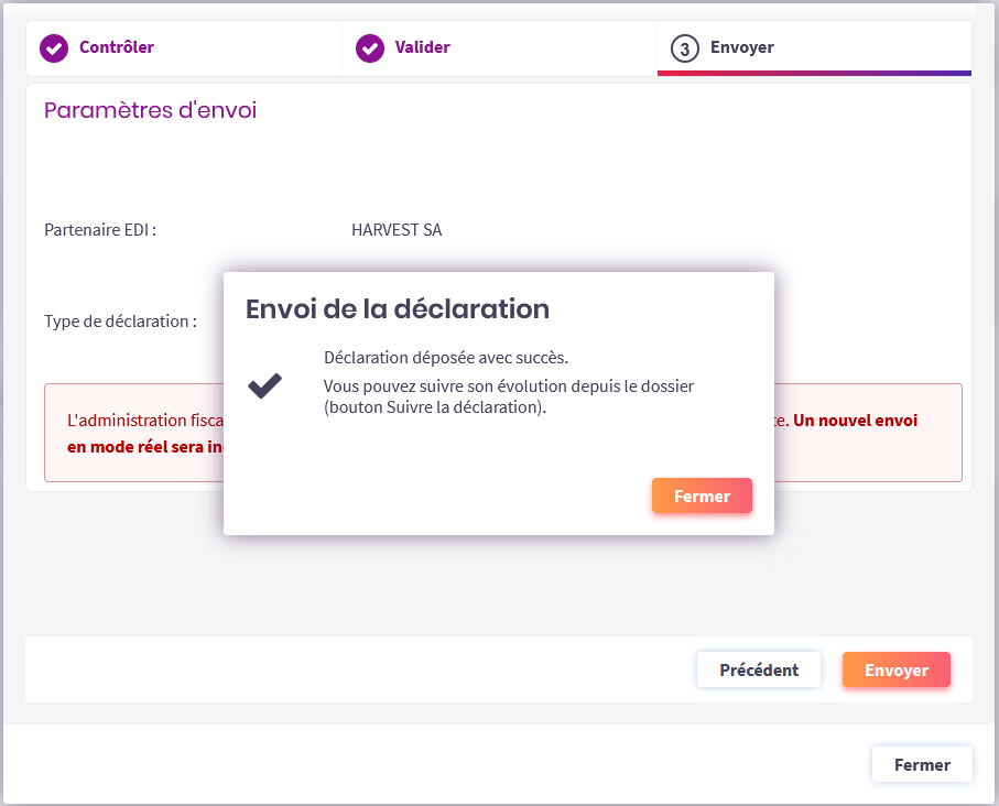 Attention : vous devrez envoyer de nouveau votre déclaration en mode réel (bouton radio Déclaration réelle sélectionné) sinon cela sera considéré comme une absence de dépôt.