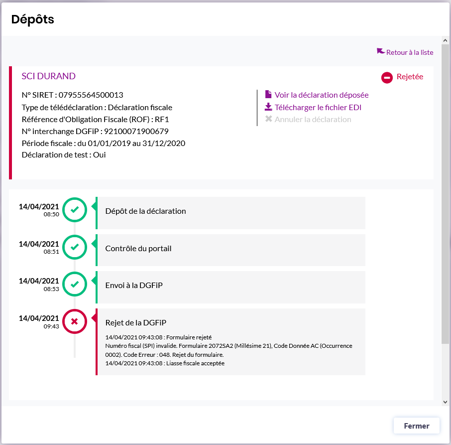 Si la déclaration a fait l’objet d’un rejet (soit du portail fiscal, soit de la DGFiP), symbolisé par une croix rouge, aucun dépôt n’a donc été validé du point de vue de la DGFiP. Un nouvel envoi, après correction de l’erreur dans le dossier, est absolument nécessaire sous peine de défaut de déclaration pour le redevable concerné.