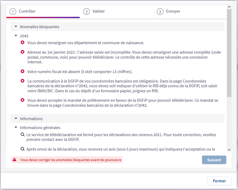 Lorsqu’aucune anomalie bloquante n’est présente, vous pouvez cliquer sur le bouton Suivant.
