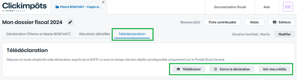 Après avoir saisi votre déclaration, depuis la section Télédéclaration du dossier, cliquez sur Télédéclarer.