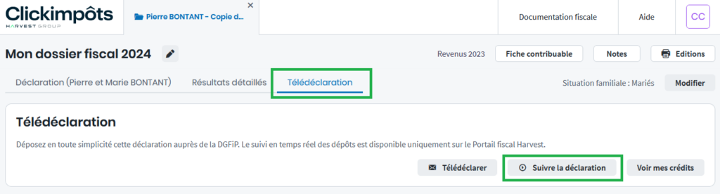 Vous pouvez suivre l’évolution de la déclaration directement depuis le dossier en cliquant sur Suivre la déclaration dans l’onglet Télédéclaration.